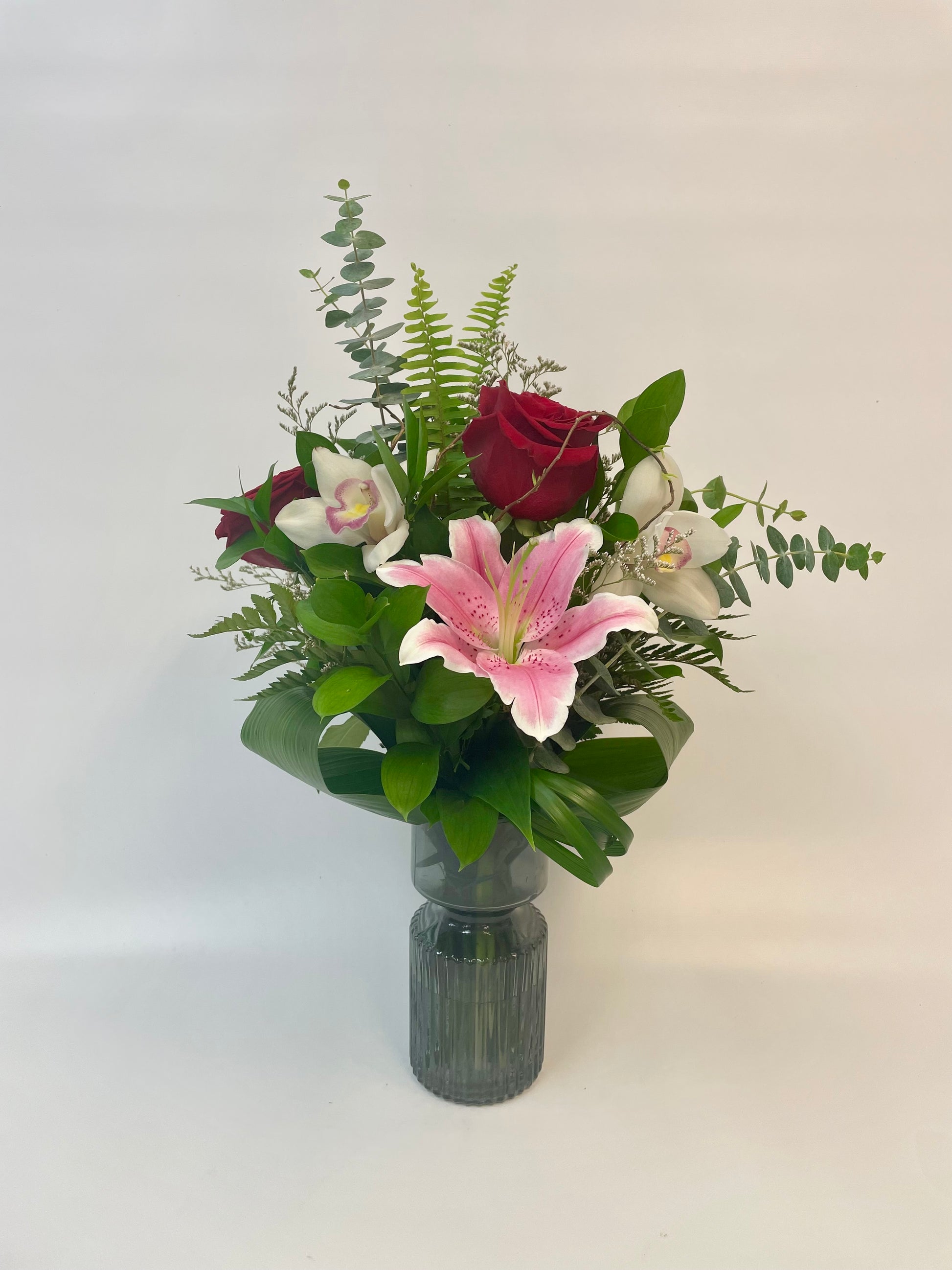 Liée de rose, lis, fleurs d'orchidée d'un vase