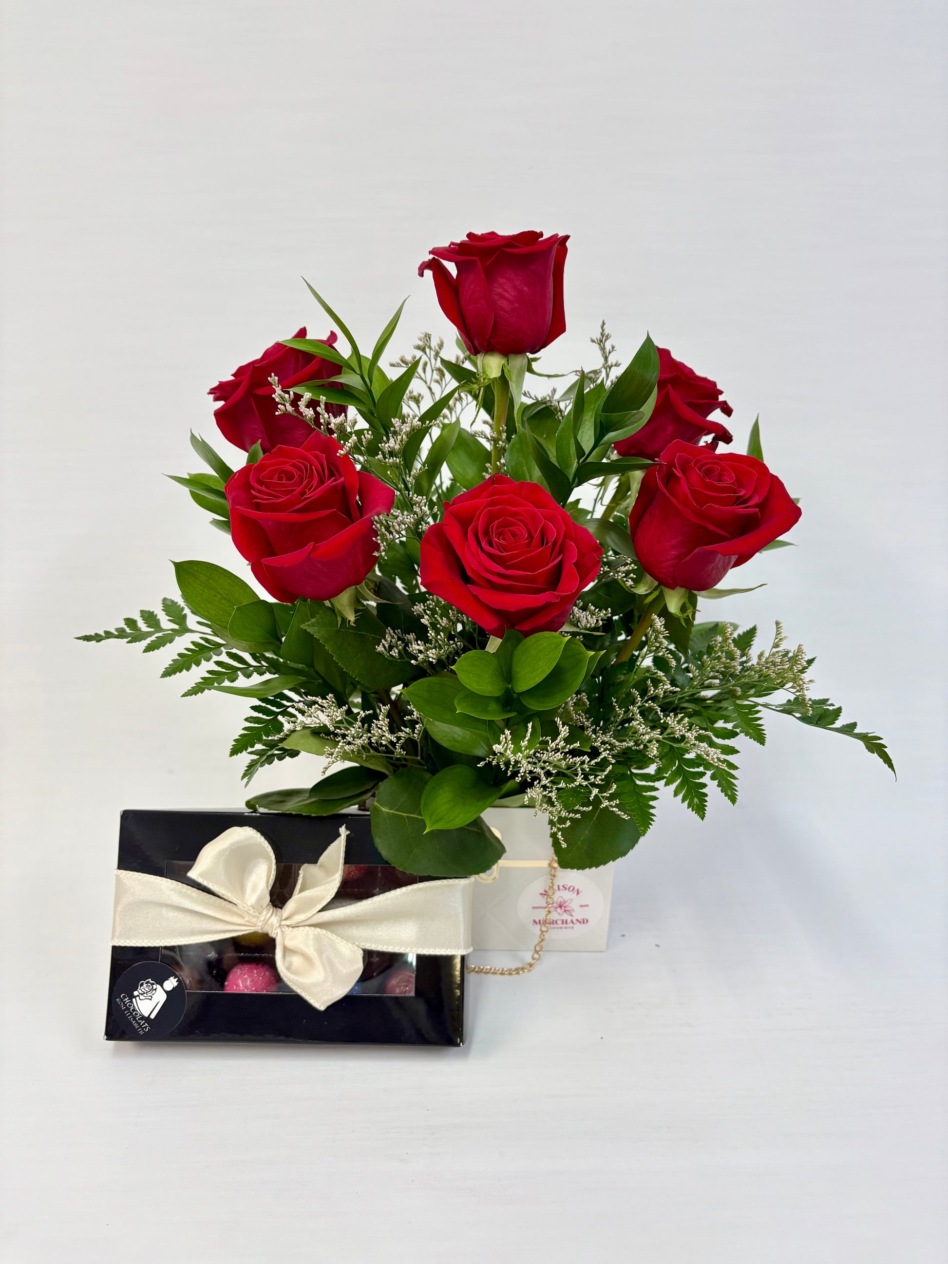Exprimez votre amour avec Je t’aime à l’Infini, un élégant arrangement de roses rouges présenté dans un sac a main, accompagné d’une délicieuse boîte de 12 chocolats fins. Ce duo romantique est parfait pour la Saint-Valentin, un anniversaire ou toute occasion spéciale où vous souhaitez déclarer votre amour avec douceur et élégance.